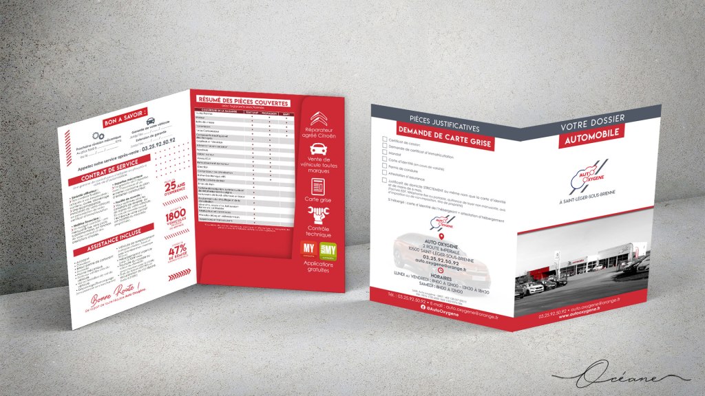 Description du projet : Création des cartes de visite, étiquette pour bouteille de Champagne et pochette à rabat de l’agent Citroën Auto Oxygène.